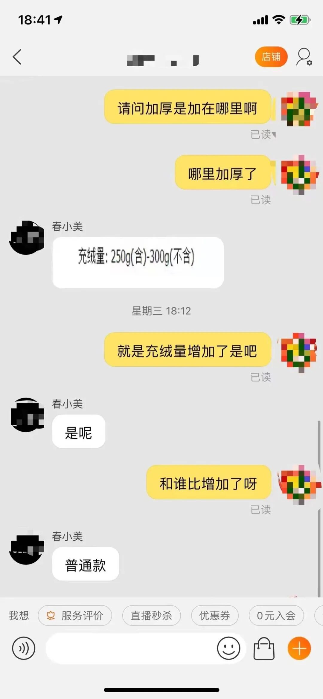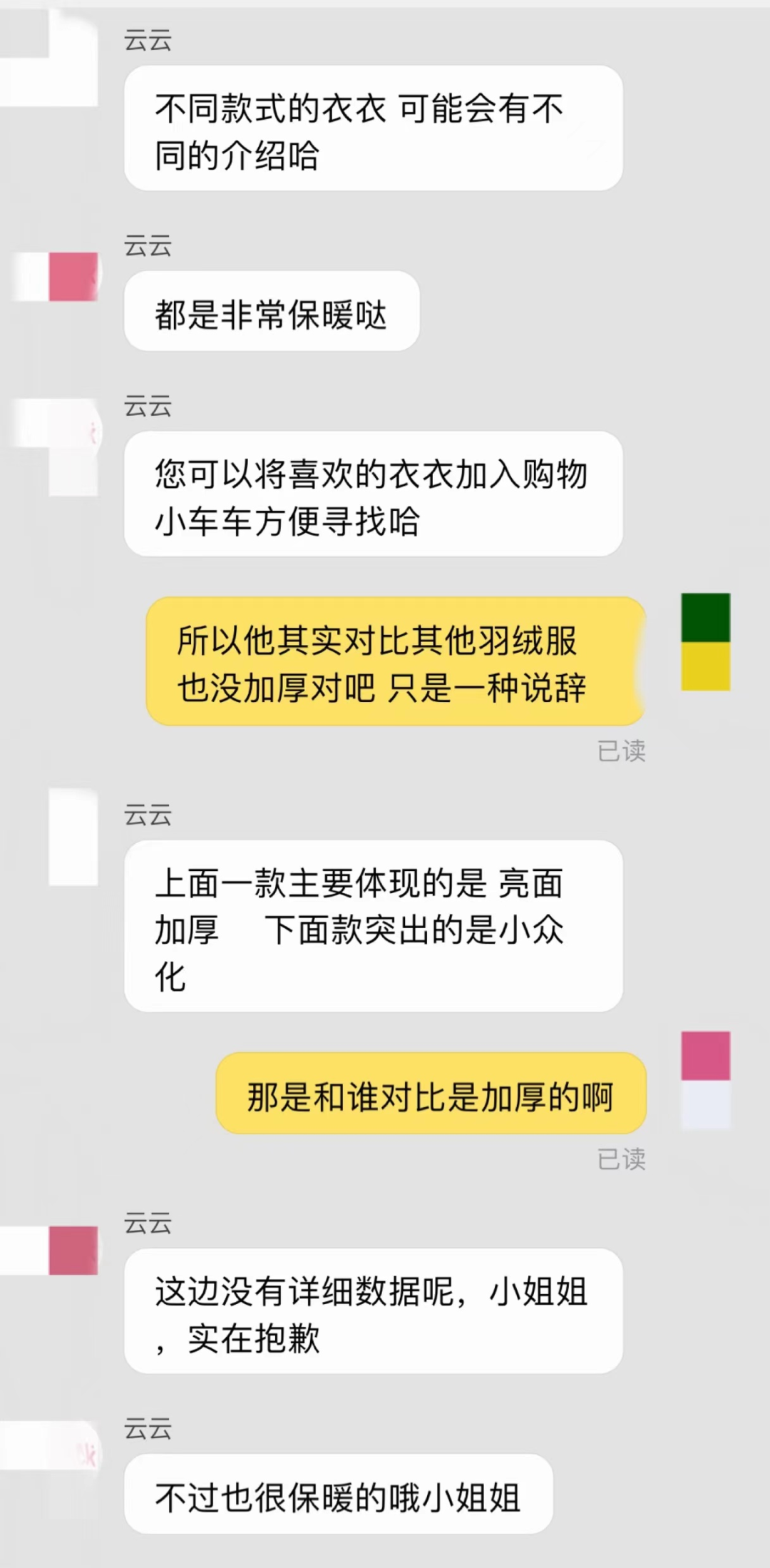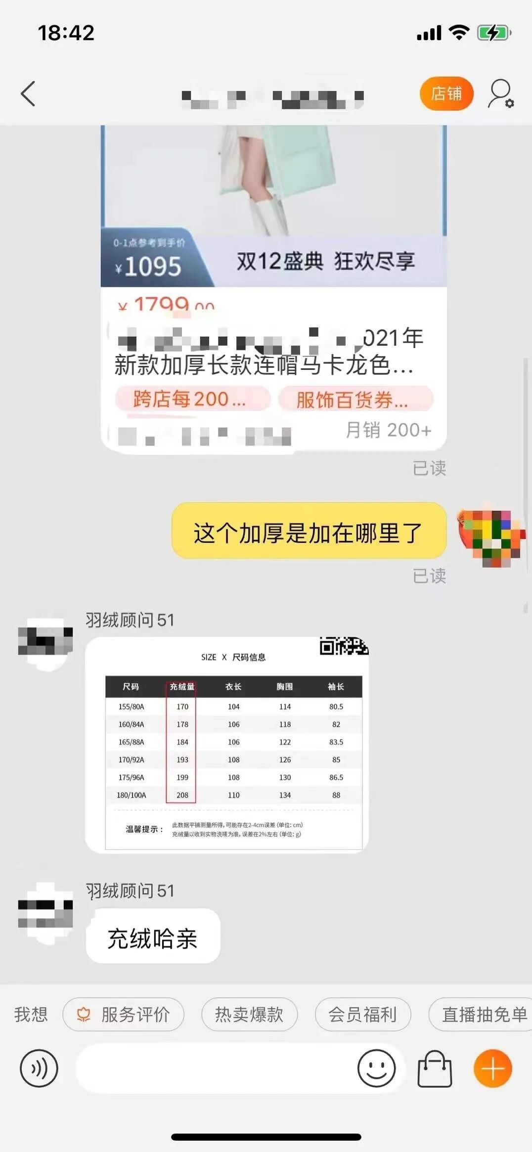 为什么加厚款的充绒量看起来反而不如非加厚款?部分商家客服表示,这是因为不同羽绒服的胸围和袖长有差异。还有客服表示,不同商品营销的重点不一致,加厚款和非加厚款“都非常保暖”。