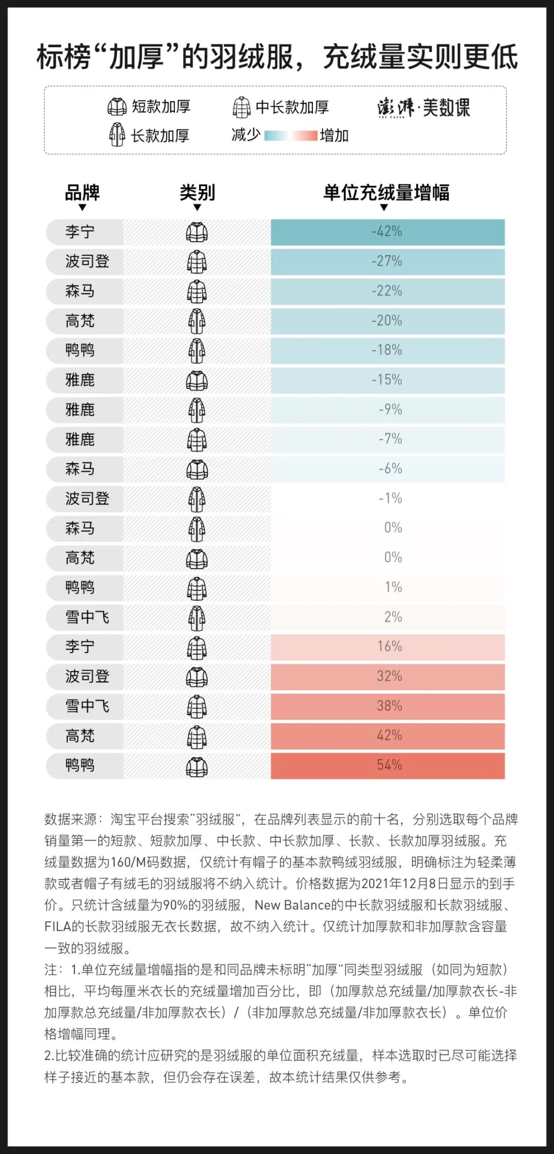 充绒量相对少,价格相对高,就一定意味着羽绒服的性价比低吗?也不一定。一款保暖的羽绒服需要精巧的设计,羽绒的蓬松度与清洁度、羽绒服的绗线工艺与款式设计,都会影响羽绒服的保暖效果,这些影响因素难以被简单量化统计,但它们也是影响价格的重要因素。