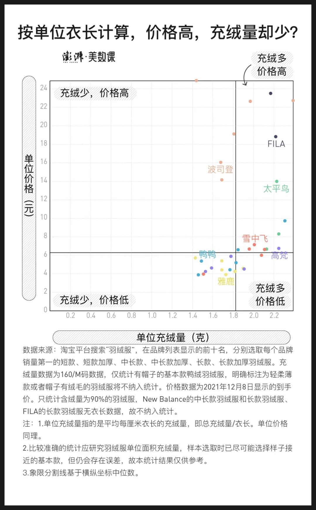 要评价一件羽绒服充绒量的多少,还应该看单位充绒量。为方便统计,澎湃新闻记者计算了这52款羽绒服平均每厘米衣长的充绒量及对应价格。结果显示,FILA、波司登等羽绒服单位价格较高,而其中,部分波司登羽绒服单位充绒量却相对较少。