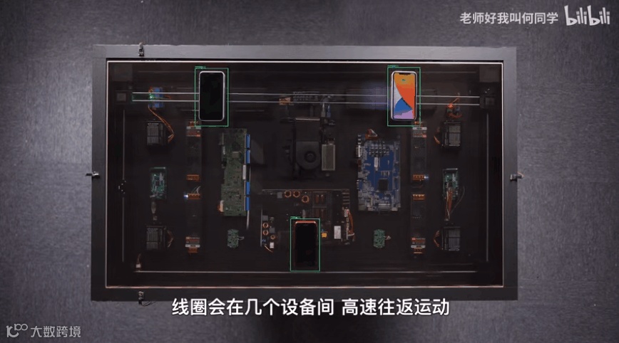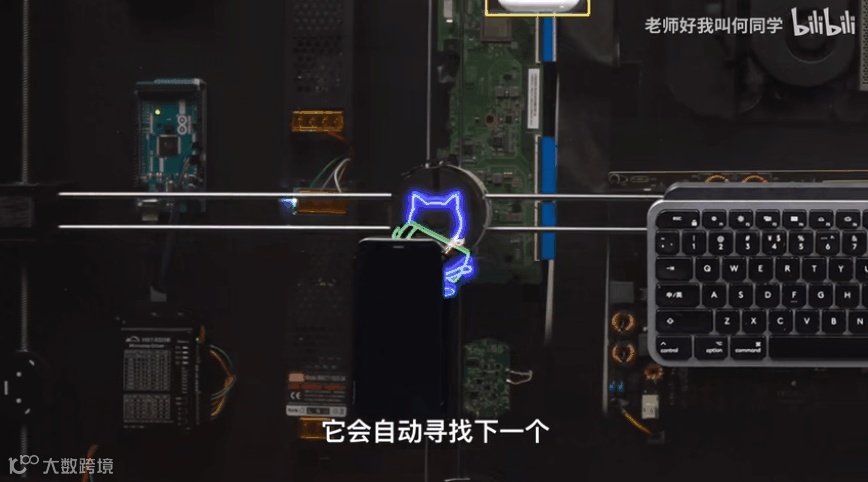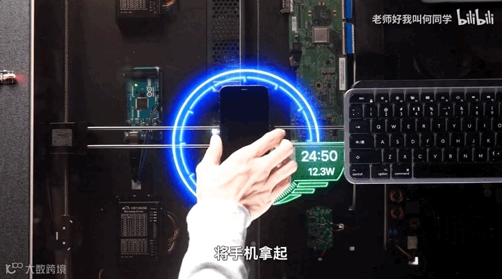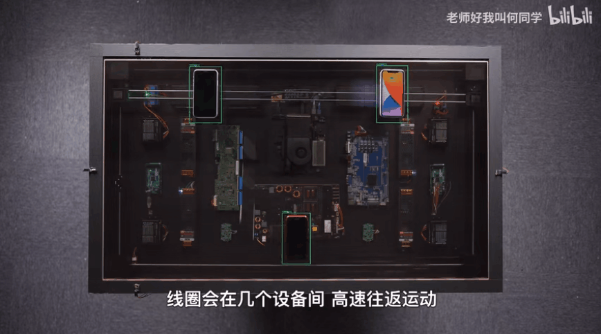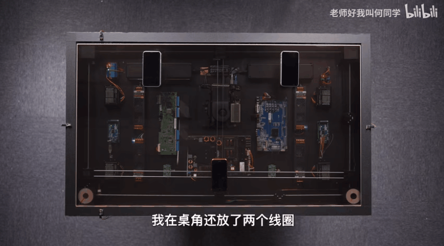 于是,何同学采用「追踪式无线充电」的方案,让一个线圈跑遍整个桌子,寻找需要充电的设备。