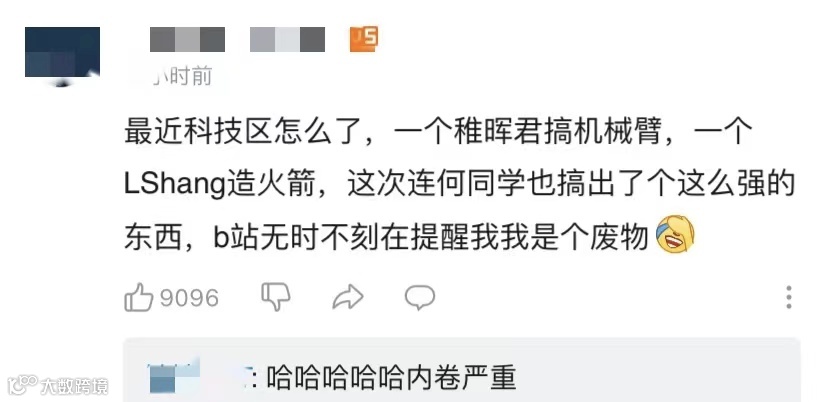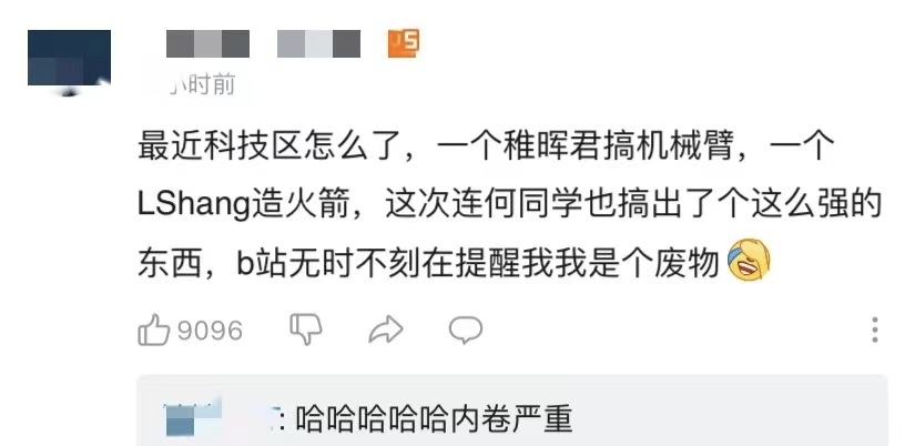 「最近科技区怎么了,一个稚晖君搞机械臂,一个LShang造火箭,这次连何同学也搞出了个这么强的东西,b站无时不刻在提醒我,我是个废物」