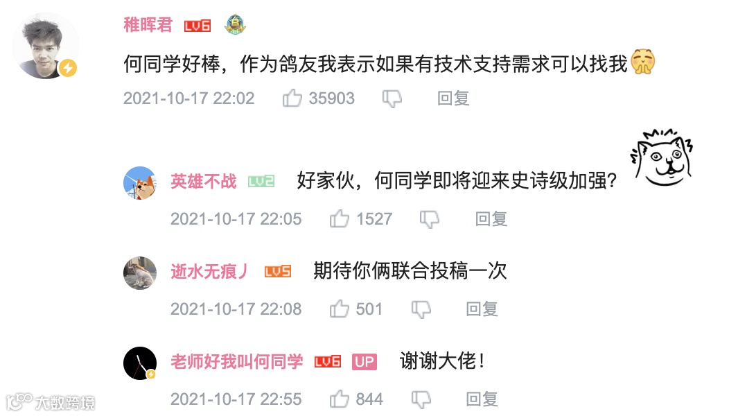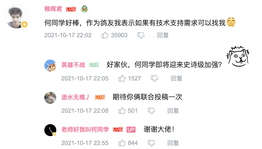 华为天才少年「稚晖君」也参与热评,「何同学好棒,作为鸽友我表示如果有技术支持需要可以找我。」