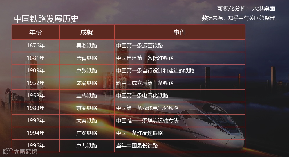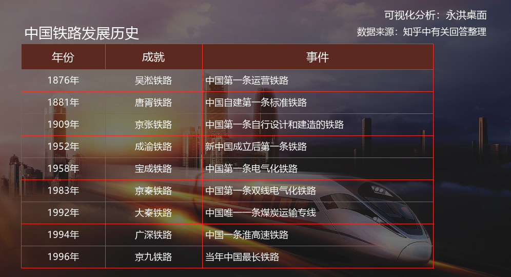 通过永洪桌面分析,1881年,李鸿章主办的“唐胥铁路”被认为是“中国铁路建筑史”的正式开端。随后在1909年,被誉为“中国铁路之父”的詹天佑 修建了中国首条 自己设计、施工的铁路---“京张铁路”。1964年,日本 造出了世界上 第一条高铁线路,紧接着欧洲也有了高铁。而那时候的中国 连坐个汽车都是奢侈的,就更别说高铁了。直到2003年,我们才第一次拥有高铁。