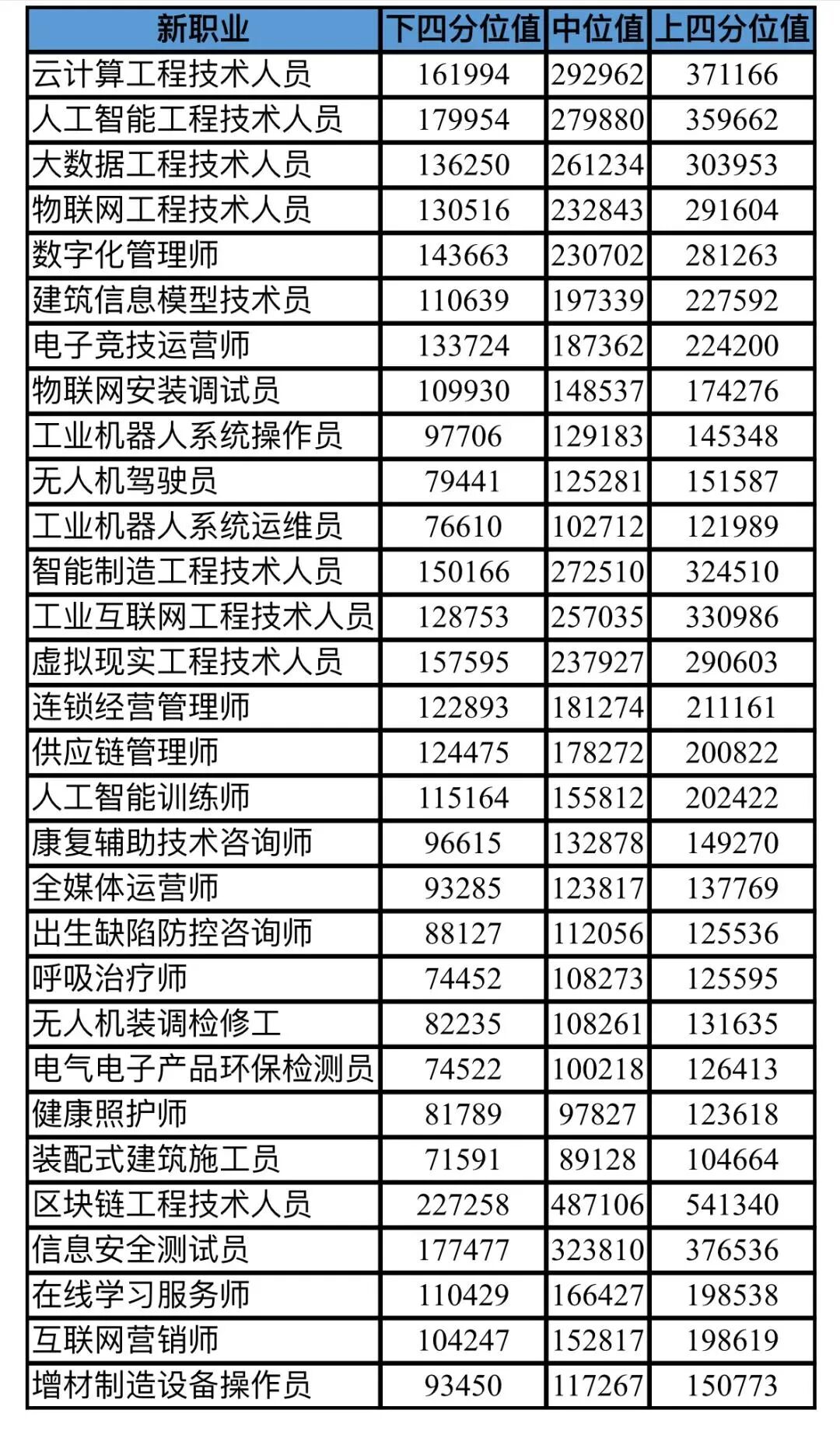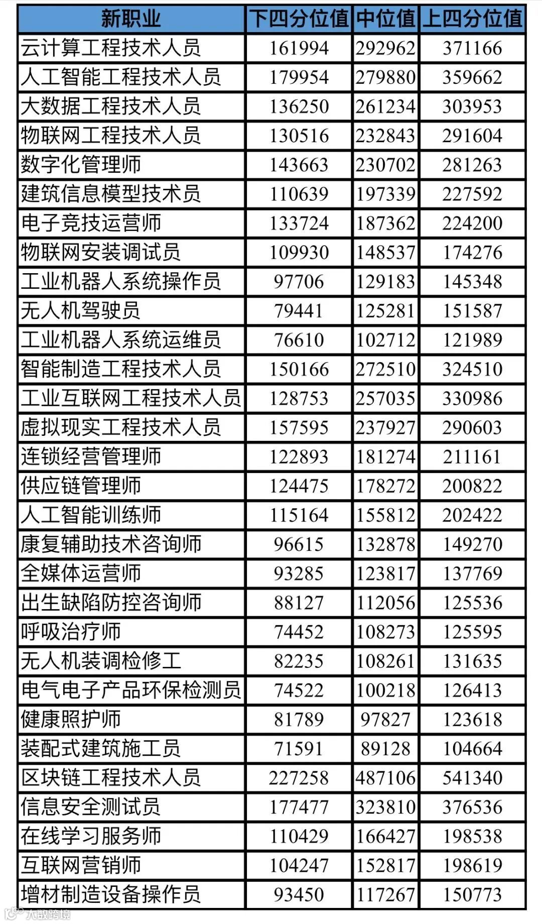 从中我们可以进一步看到:云计算、人工智能、大数据、物联网、数字化等领域新职业收入最高,中位年薪均超过20万,第一名是云计算工程技术人员,中位值达29.3万元。