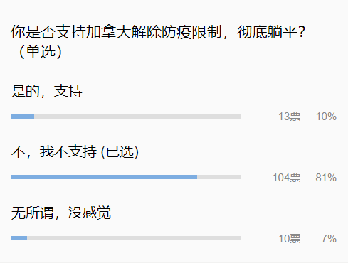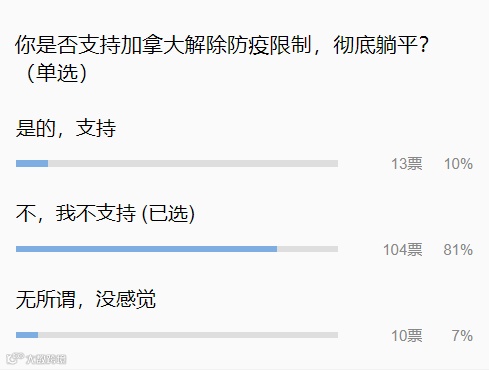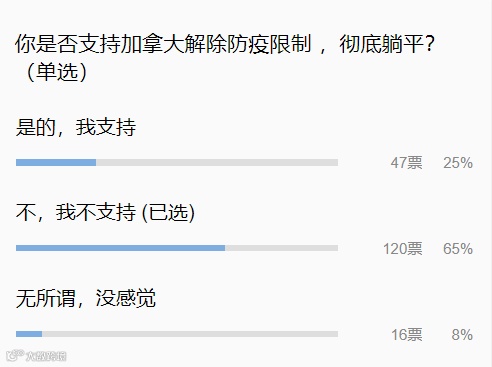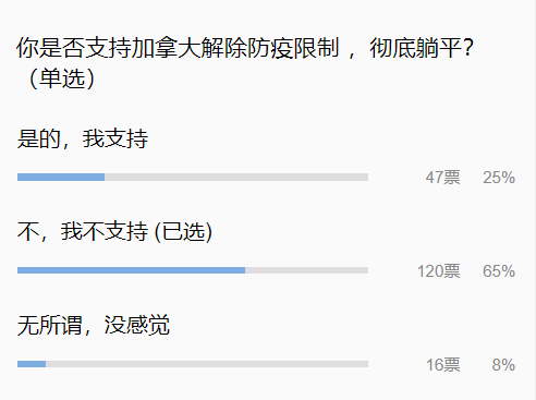 而根据昨天的调查,加新网和加拿大热点的华人读者中,大多数人还是不支持解除防疫限制的: