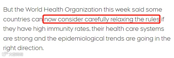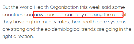 世界卫生组织本周曾表示,只要具有高免疫率、强大的医疗保健系统并且流行病学趋势正朝着正确的方向发展,一些国家现在可以考虑谨慎放宽限制。