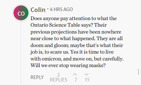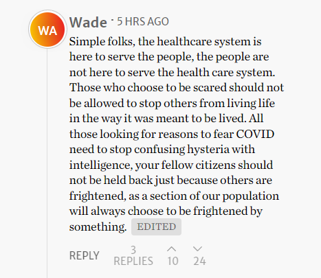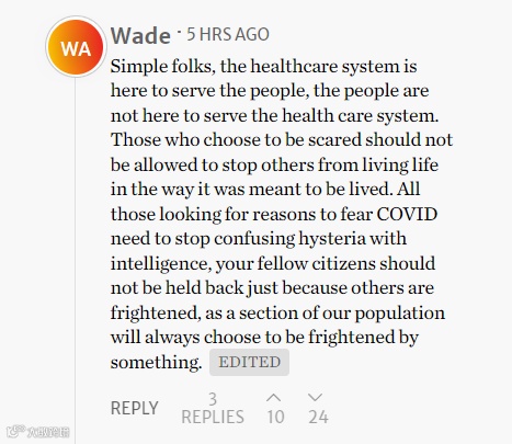 “医疗系统是用来服务人的,而不是让人来服务的,加拿大人不应该被那些胆子小的人绑架,以至于不能过上正常生活。”