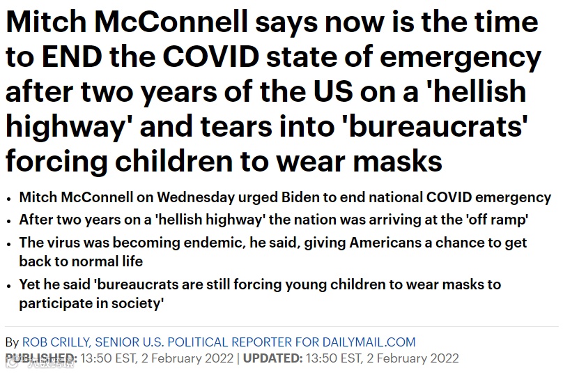 美国参议院多数党领袖米奇·麦康奈尔(Mitch McConnell)今天也敦促拜登政府结束全国新冠紧急状态,让美国人的生活重回正轨。