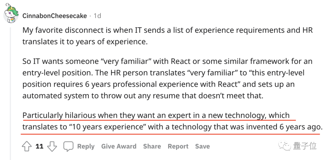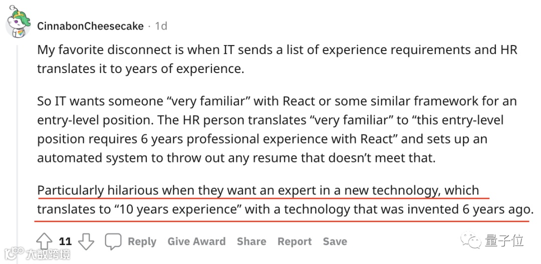 比如说要招聘新技术领域的专家,技术部门的描述是“非常熟悉React或类似框架”,而HR则将这个“非常熟悉”翻译或者理解成了“需要在React框架上有6年经验”。