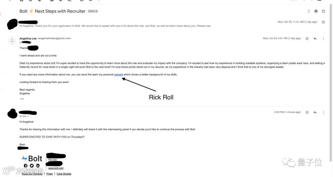 而且天使姐在邮件交流过程中,链接里附带的依旧是Rickroll整蛊的图片。