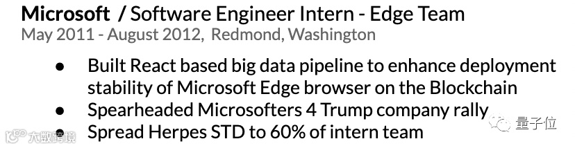 再例如在微软的工作经历中,这位工程师称“带领微软员工重整特朗普公司”。