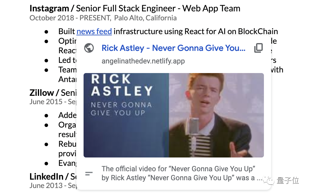 而且简历里的所有超链,都不是与之相关的链接地址,点一下你就会发现被Rickroll了。