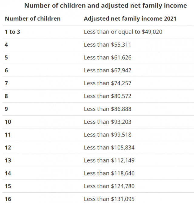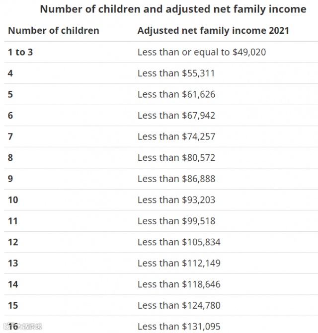 在有1至3名孩子的家庭,家庭年收入净值不超过49020元才能领取。