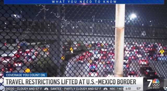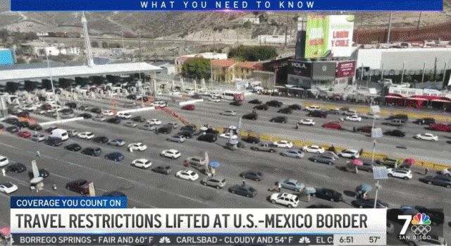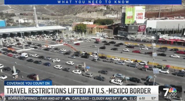 与此同时,墨西哥-美国边境也开放了,车队更加拥挤(实拍图如下)。