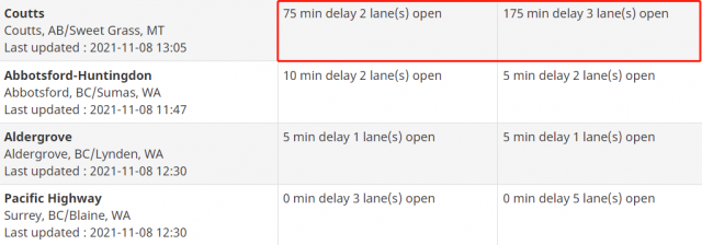 据加拿大政府官网的动态更新显示,今天下午1点左右,在阿省和蒙大拿州的Coutts陆路过境点仍然被挤爆,游客通道有175分钟的延迟。不过,其他大部分过境点都已经很顺畅,个别过境点会有超过10分钟的等待。