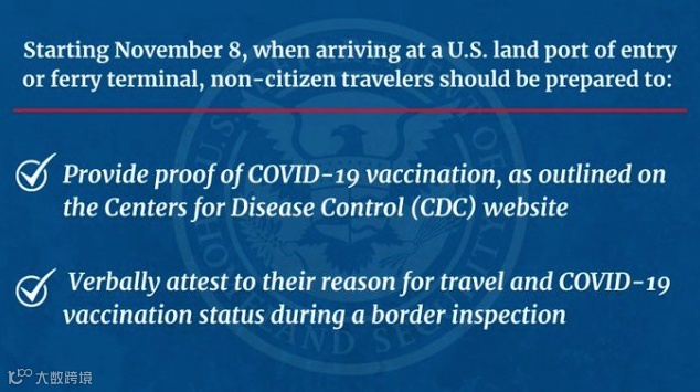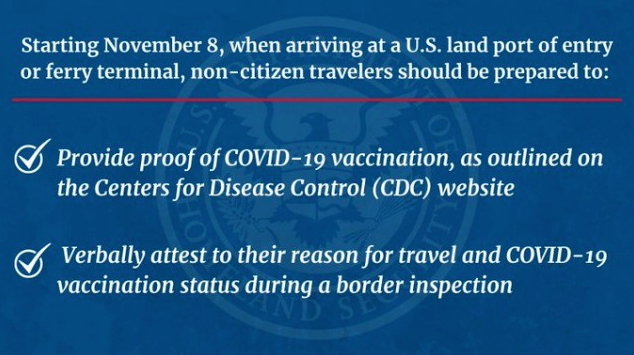 根据美国国土安全部(DHS)的规定,旅行者必须准备回答口头提问:他们是否已完全接种疫苗以及前往美国的原因,在要求下,必须提供他们的疫苗接种状况的证据。