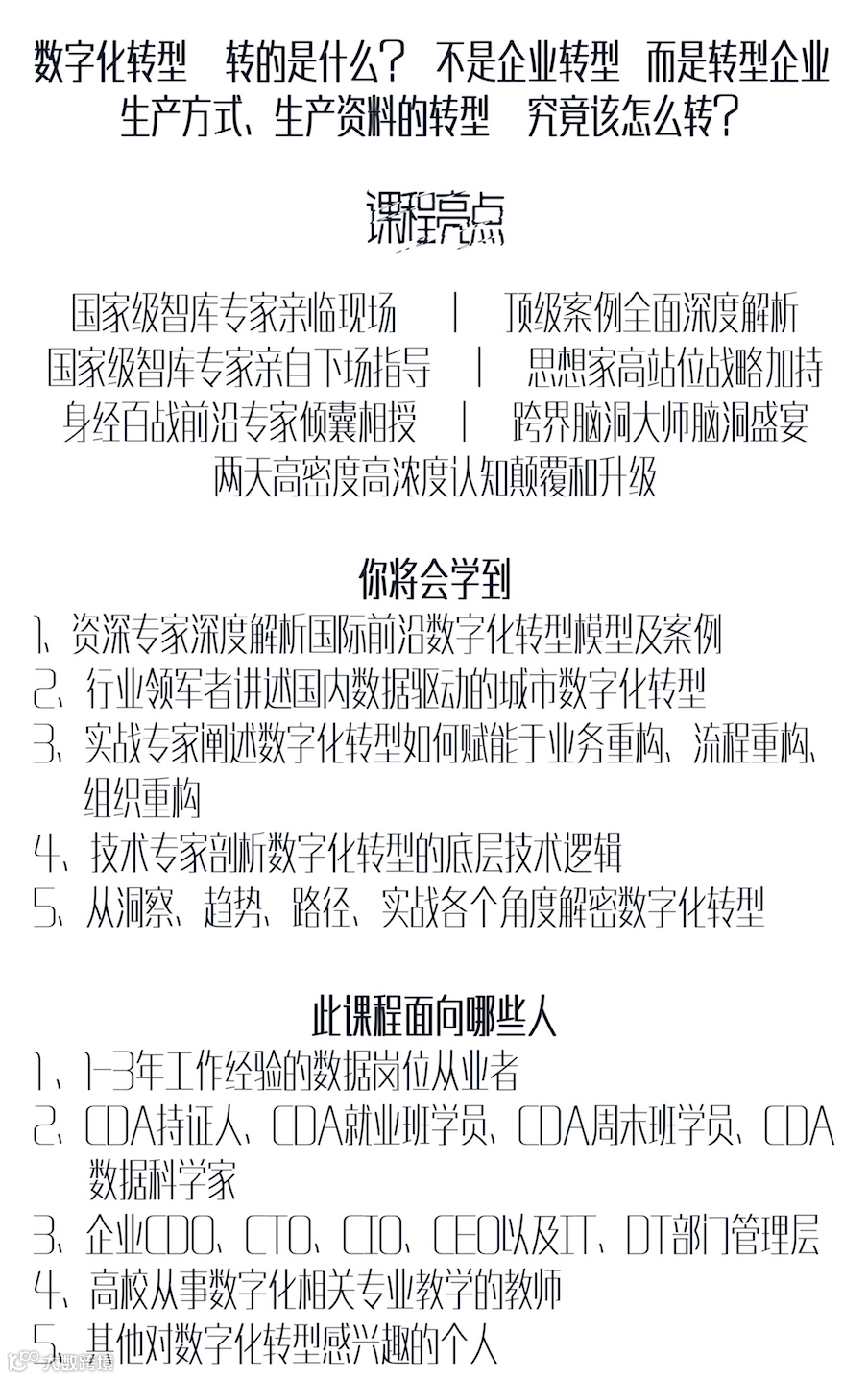 在此背景下,国内数据分析人才教育品牌CDA数据分析师联合国内思想产品优质生产机构苇草智库重磅推出《数字化转型研修课》战略班。课程内容由国家级智库专家亲临现场,通过顶级案例全面深度解析数字化转型,国家级智库专家亲自下场指导企业数字化转型的方向,旨在解决以下问题:数字化转型,转的是什么?不是企业转型,而是转型企业 生产方式、生产资料的转型究竟该怎么转?