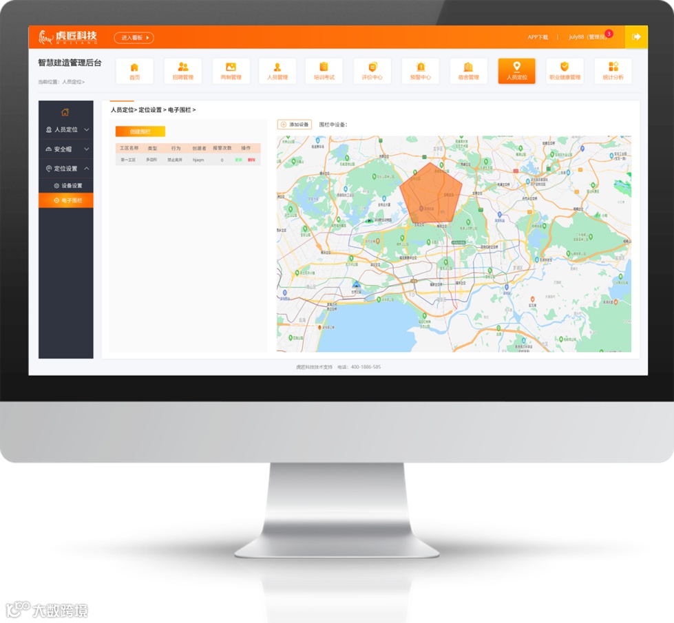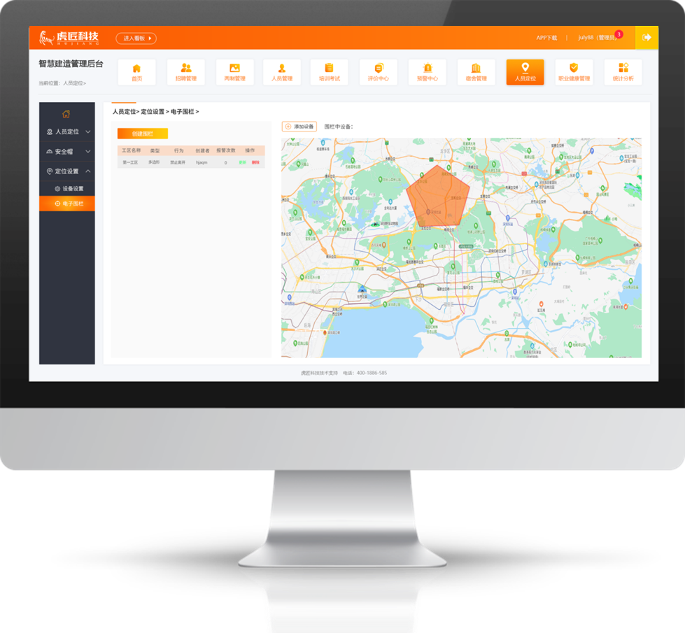 通过虎匠定位系统设置电子围栏,现场佩戴虎匠定位安全帽的人员进出围栏系统会进行记录,有违规操作会进行报警,系统管理员可远程知晓现场人员位置以及施工情况。