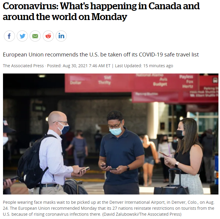 周一,欧盟建议叫停从美国赴27个欧盟成员国的“非必要”旅行,主要原因是近期美国新冠变种传播迅速,而疫苗接种率则落后于欧洲国家的平均接种率。