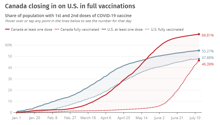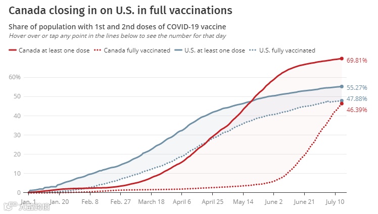 加拿大和美国最新疫苗接种人口比例(红线加拿大,蓝线美国)