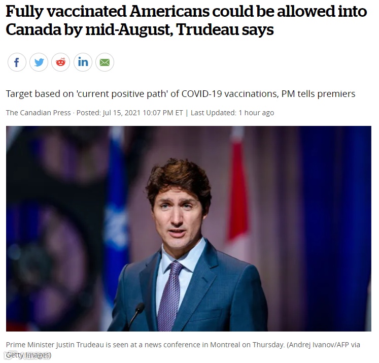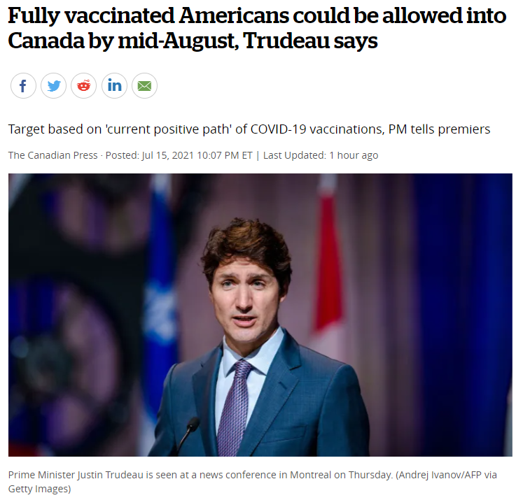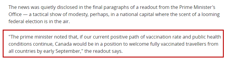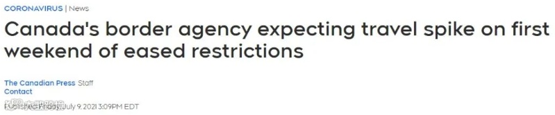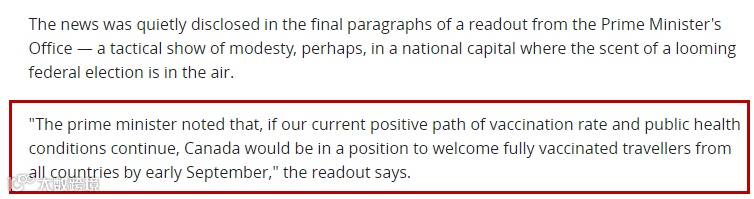 同时,特鲁多透露,如果目前的疫苗接种率保持正常上升趋势,来自世界各地的完全接种疫苗的旅客将会被准许9月初入境。(换言之,加拿大将在9月对全球旅客开放入境)