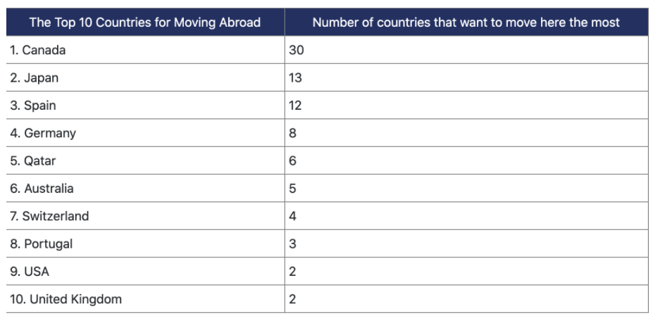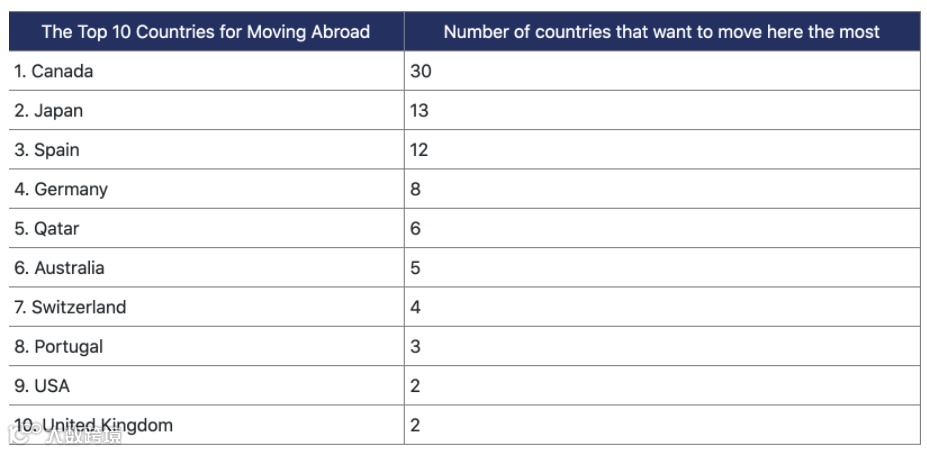 根据Remitly公司公布的调查,“世界10大移民首选国家”分别是:加拿大、日本、西班牙、德国、卡塔尔、澳洲、瑞士、葡萄牙、美国和英国。