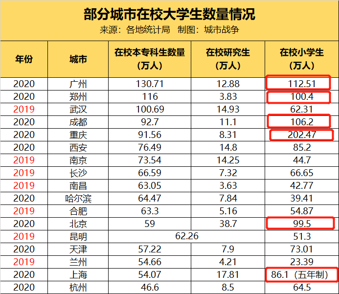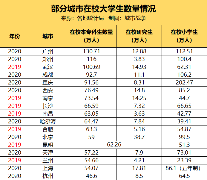 除了广州,近期还有多个城市相继发布了2020年的统计公报,我们分别统计了各大城市在校大学生、在校研究生、在校小学生的在校生数量,并做出了排名。