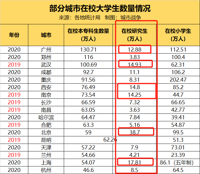 仅次于北京、上海的是武汉、西安和南京,分别达到14.93万、14.8万和14.25万(武汉、南京为2019年数据),和上海的差距不算太大。广州的研究生数量也有12.88万,显示广州的大学质量也还行。