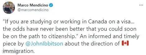 就在2月18日晚上,移民部长Marco Mendicino突然发布了一条激动人心的推特:“如果你目前持有效签证,在加拿大境内学习或工作,你即将成为公民的可能性,比以往任何时候都高。”
