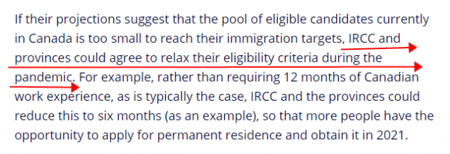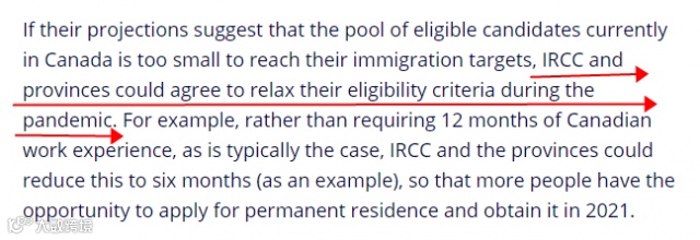 如果目前境内的合格申请人数太少导致无法实现起移民目标,IRCC和各省移民部或将同意在疫情期间临时放宽标准。例如,将12个月的加拿大工作经验要求减少至6个月,从而使更多人有机会在2021年申请并获得PR。