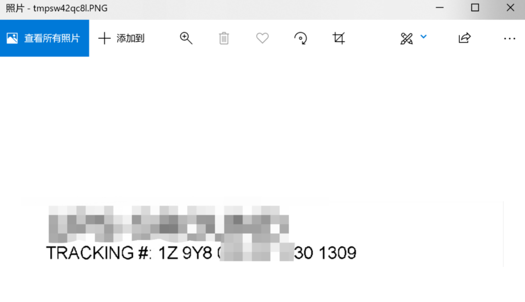 弹出图片并恢复到了正位,接下来分别截取需要提取部位字符串的图片了,尽量让图片中只有需要识别的部分,获取识别出来容易简单处理获得需要的内容 截取图片用 image.crop((left, top, right, bottom))四个参数需要反复调试才能确定。首先提取 TRACKING# 部位需要的内容,经确定四个参数分别是 350 600 1350 730,尝试截取和预览图片: