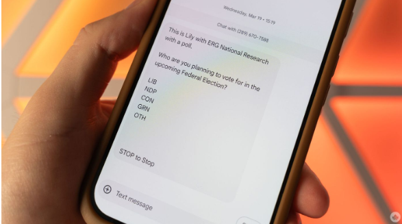 本月早些时候,一位记者收到了一条自称来自ERG National Research的短信,称其正在进行有关即将到来选举的投票调查。尽管信息看似正常,但在搜索ERG后,记者发现加拿大研究洞察委员会(CRIC)曾发布警告,称已收到关于ERG的投诉。