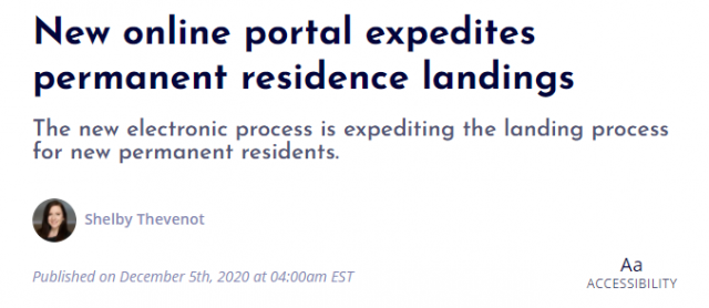 该门户网站允许新的永久居民与加拿大移民,难民和公民身份(IRCC)共享他们的个人信息。新的永久居民还可以声明其抵达加拿大,确认其地址,提交近期照片以制作其PR卡,并获得其永久居民身份的证明。