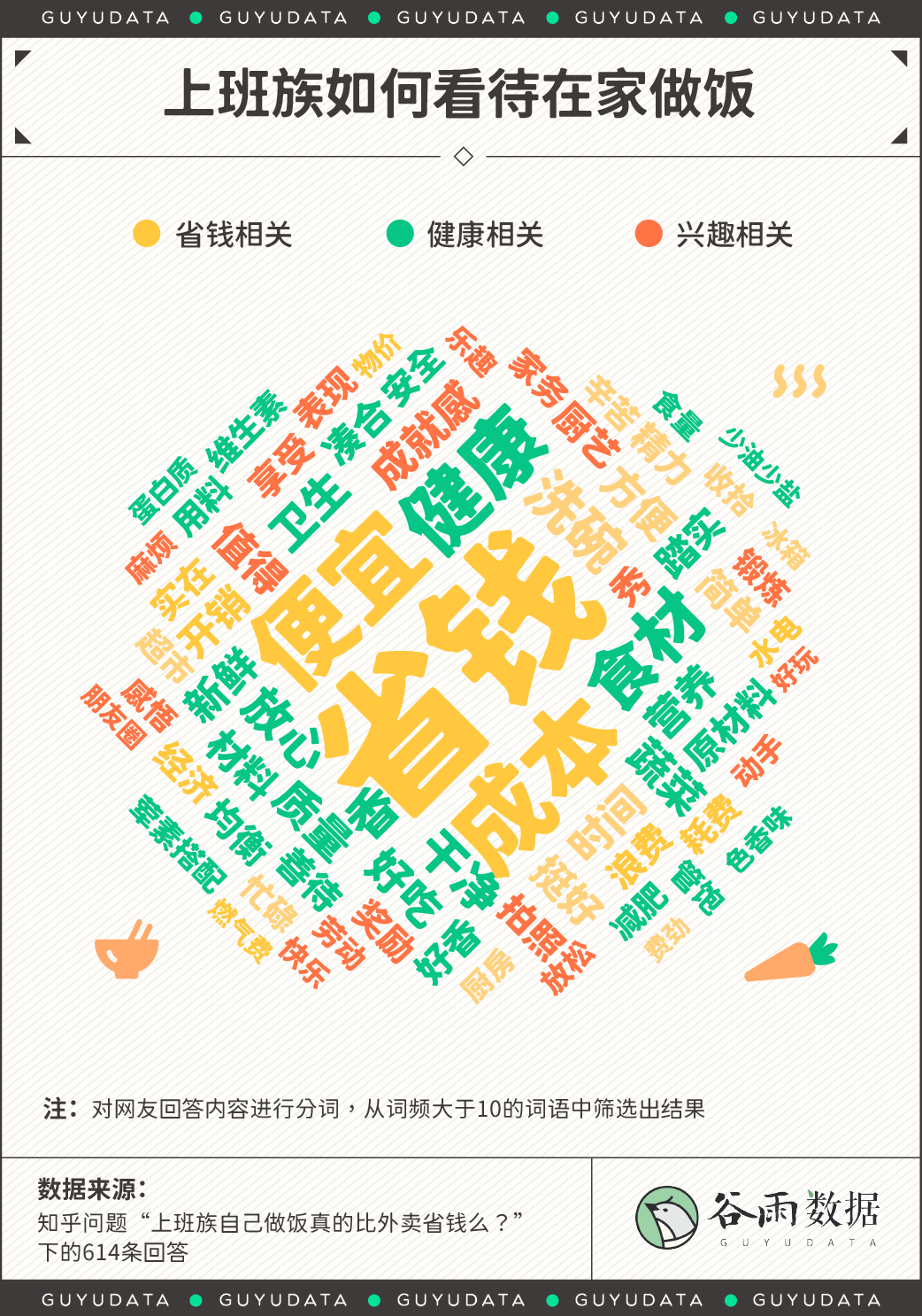 他们在对比自己做饭与叫外卖时,除了看重做饭比外卖省钱,还看重自己做饭的健康、干净、营养、安全等,很多人享受做饭的乐趣。