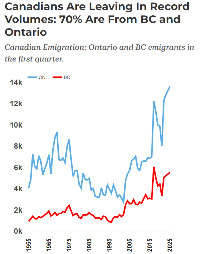 根据加拿大统计局(Stat Can)公布的一份移民数据,2025年第一季度的移民外流数量达到了2.71万,比去年增长了3%,是有史以来最大的人口外流之一。