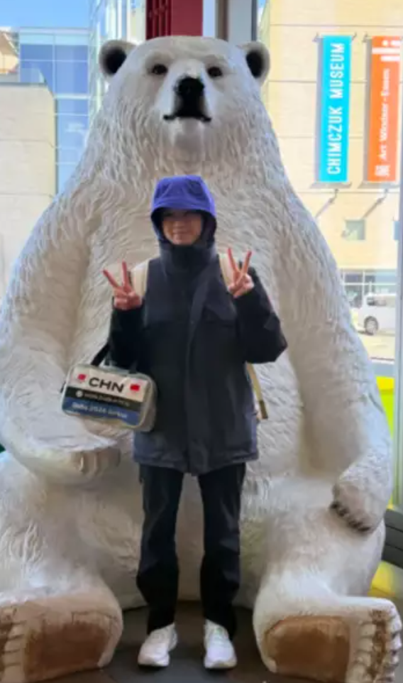 全红婵一下飞机,就兴奋地晒出了和大北极熊雕塑的合影,还在纪念品店戴上小帽子拍照耍酷。