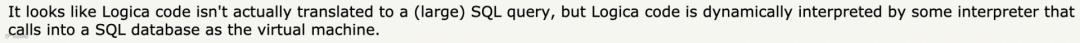 有人认为Logica没有真的做到转SQL,只是用了作为虚拟机的解释器动态“翻译”的。