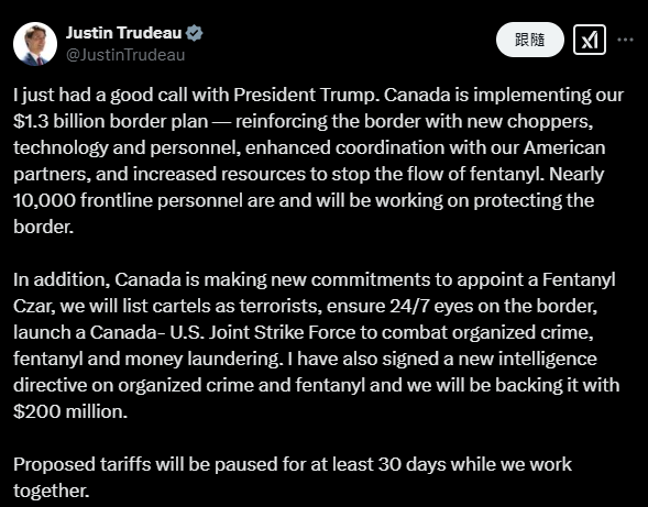 昨天下午。特鲁多宣布:美国同意对加拿大推迟征税30天!