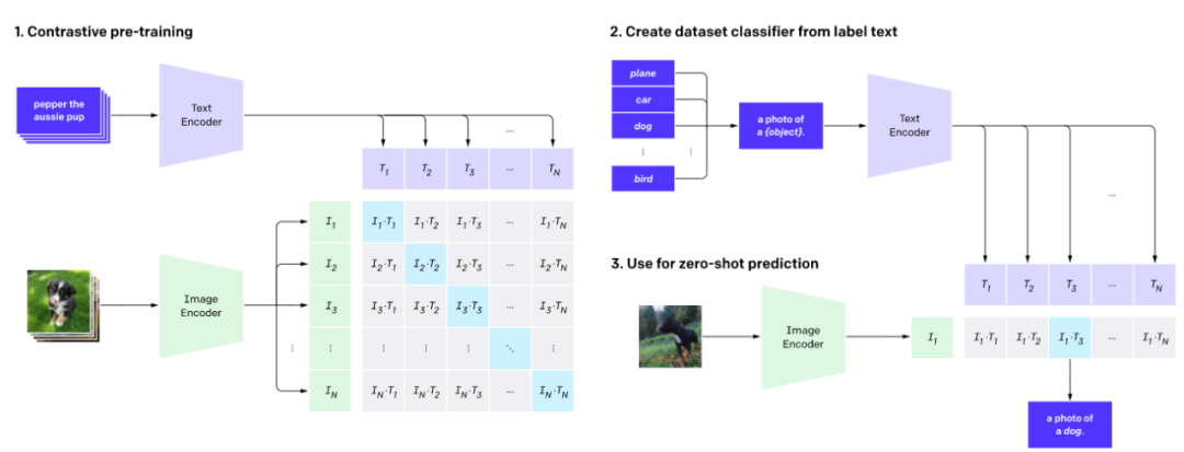 狗和猫照片的分类任务流程如下图所示,其中包括对比预训练、从标签文本中创建数据集分类器和 zero-shot 预测。