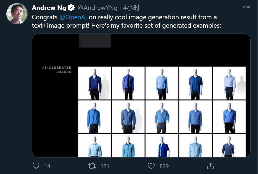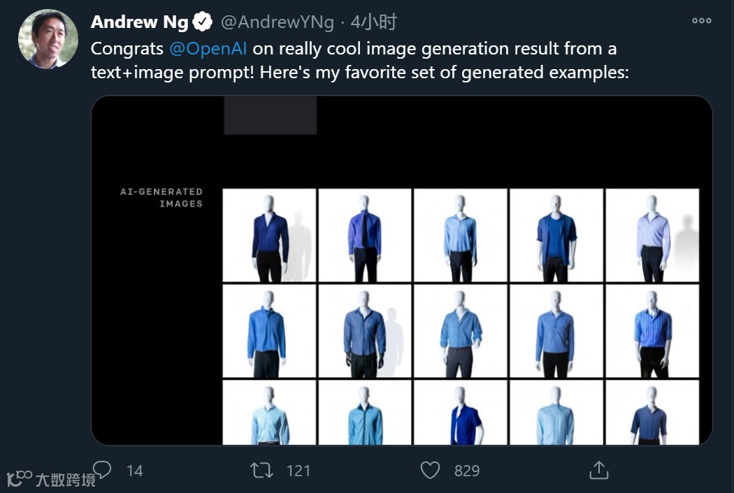 Coursera 创始人、斯坦福大学教授吴恩达也表示祝贺,并选出了自己喜欢的「蓝色衬衫 + 黑色长裤」AI 设计。