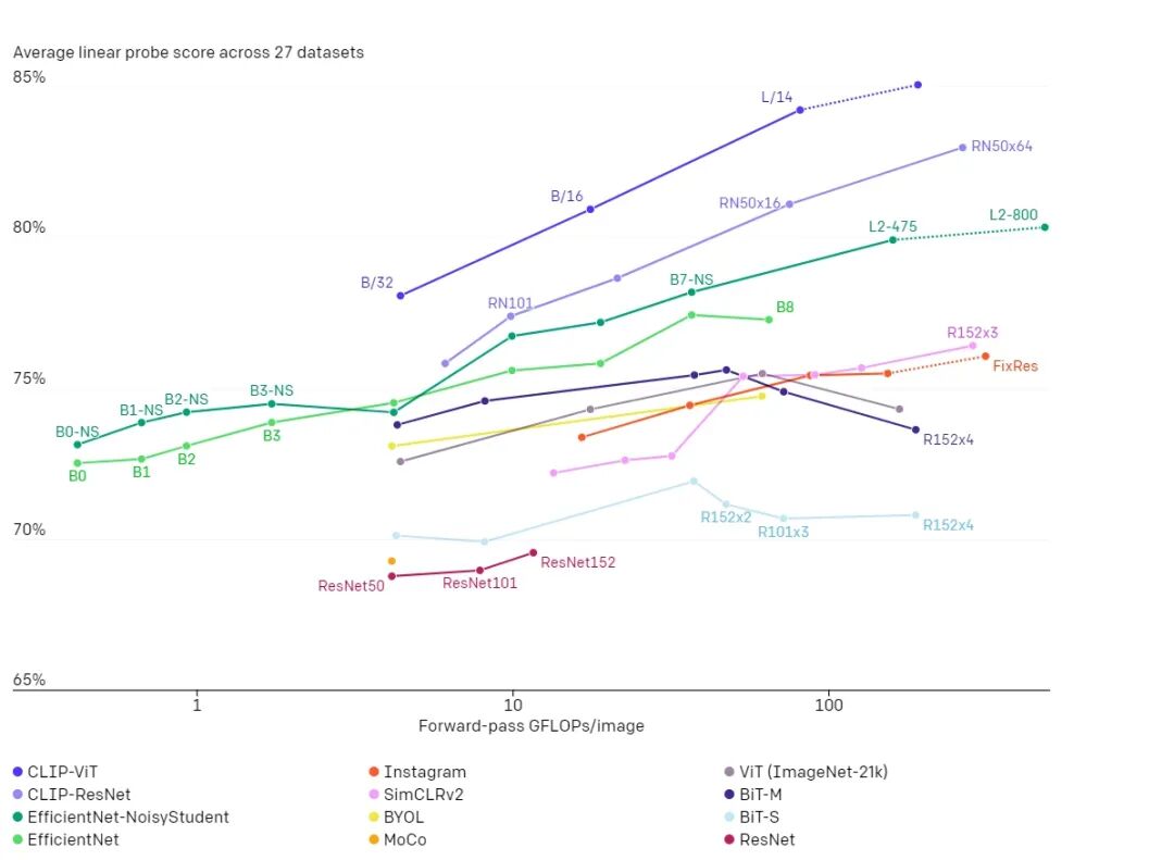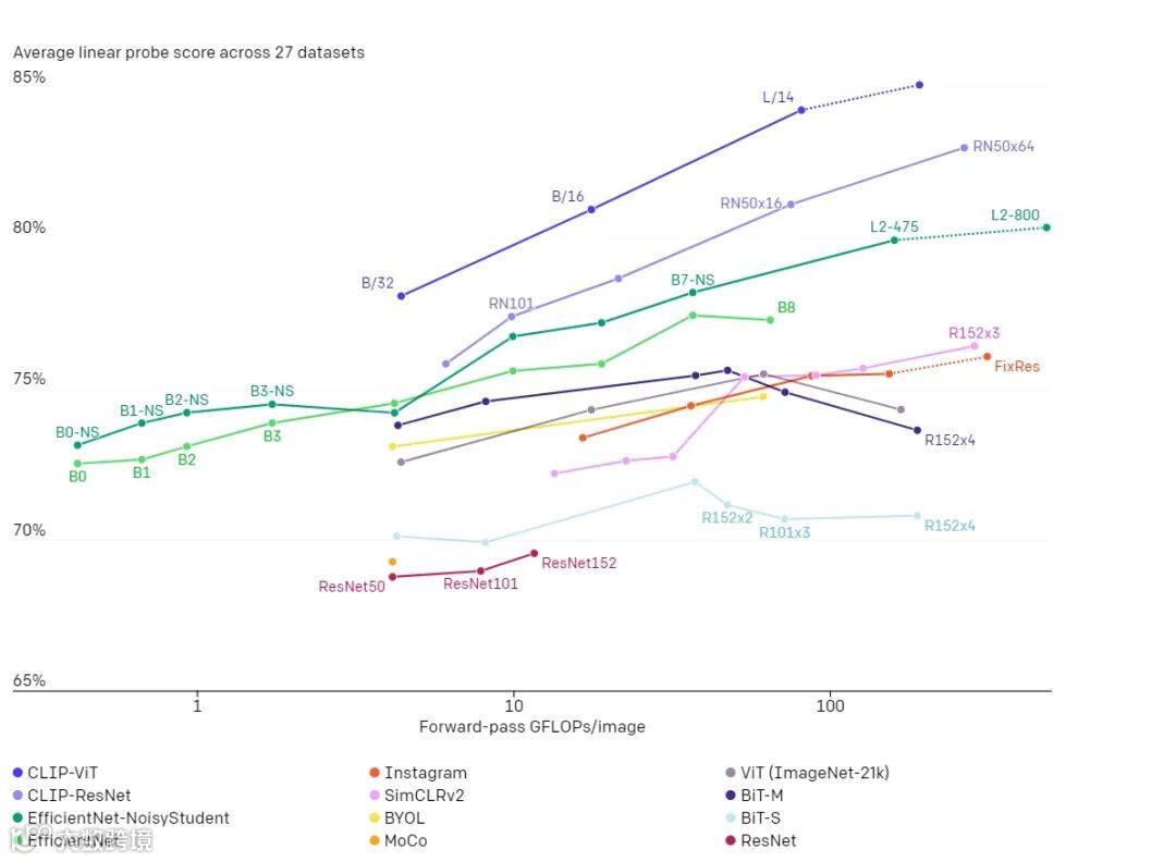 第二种算法采用 Vision Transformer,使得计算效率相比标准 ResNet 有 3 倍提升。最后,表现最好的 CLIP 模型在 256 个 GPU 上训练了 2 周左右的时间,这与目前大型图像模型类似。