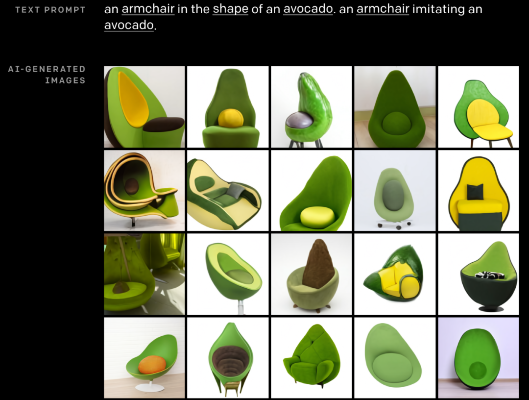 DALL·E 示例。给出一句话「牛油果形状的椅子」,就可以获得绿油油、形态各异的牛油果椅子图像。