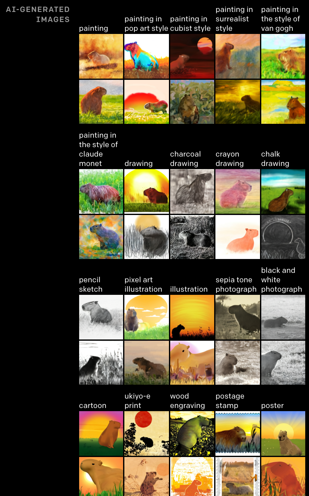 下图展示了 AI 生成的「看日出的水豚鼠」,这些图像具备不同的风格,如波普艺术风格、超现实主义风格、浮世绘风格等等。