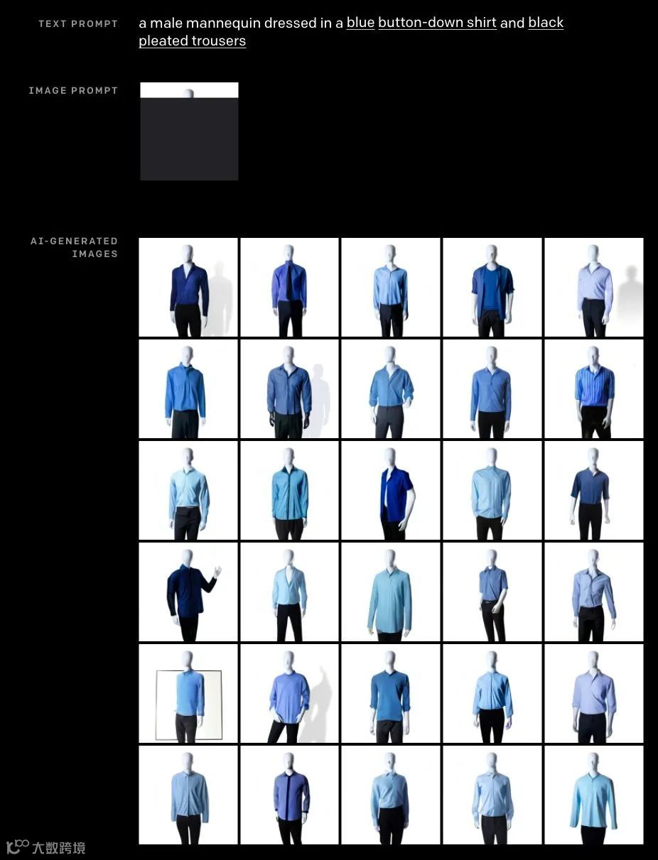 DALL·E 还可以应用到时尚设计与室内设计,例如身穿蓝色衬衫和黑色裤子的橱窗模特:
