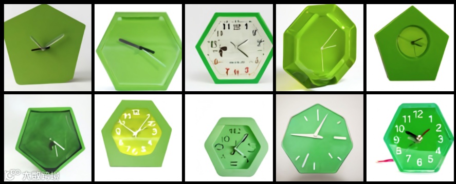在修改对象属性的能力方面,研究者对 DALL·E 进行了测试。DALL·E 可以用多边形形状渲染熟悉的对象,甚至是在现实世界中不太可能发生的情况。比如这些诡异的「绿色闹钟」: