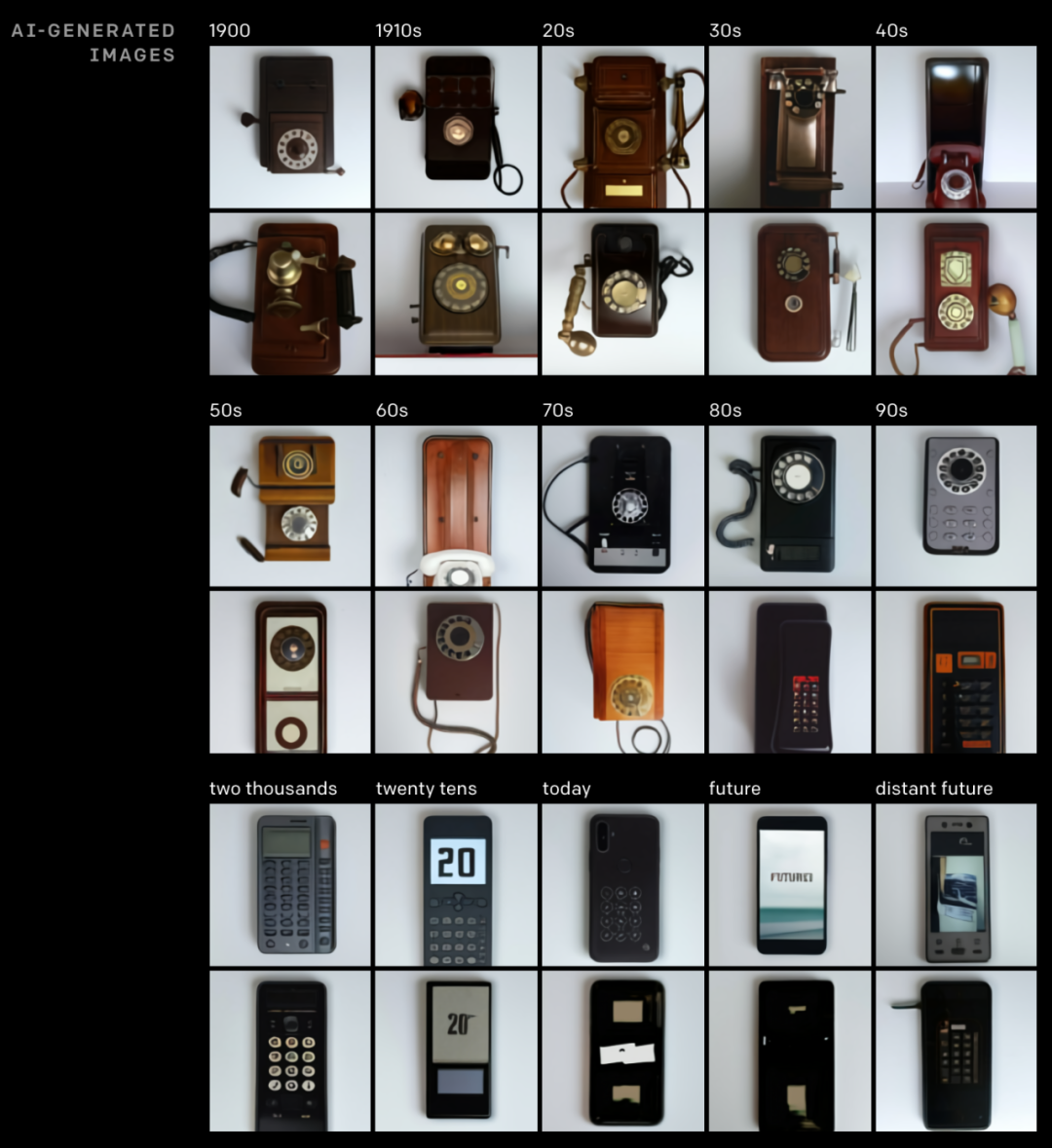 DALL·E 的能力可不止于此,它还可以展示某个概念的时代变迁史。例如给出文本「上世纪 20 年代以来的手机图像」,你将会得到各个年代的手机照片:
