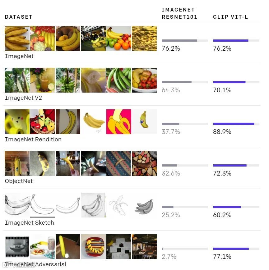 另一个神经网络 CLIP 能够可靠地执行一系列惊人的视觉识别任务。给出一组以语言形式表述的类别,CLIP 能够立即将一张图像与其中某个类别进行匹配,而且它不像标准神经网络那样需要针对这些类别的特定数据进行微调。在 ImageNet 基准上,CLIP 的性能超过 ResNet-50,在识别不常见图像任务中的性能远超 ResNet。