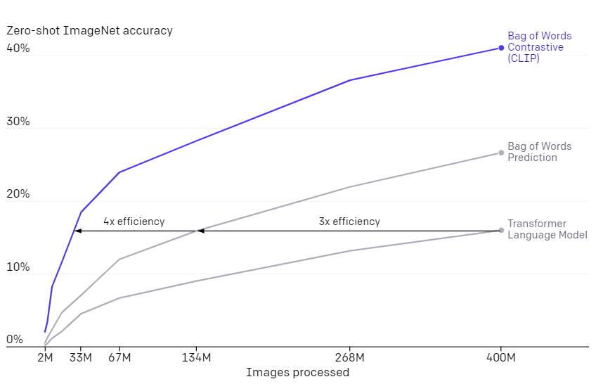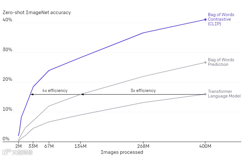 结果表明,经过 16 天的 GPU 训练,在训练 4 亿张图像之后,Transformer 语言模型在 ImageNet 数据集上仅实现了 16% 的准确率。CLIP 则高效得多,实现相同准确率的速度快了大约 9 倍。具体如下图所示: