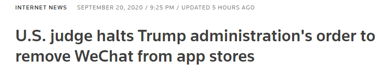 就在美国将于今天(9/20)起屏蔽中国应用程序微信,并使得微信在全美面临全面禁令时,一名联邦法官判决总统川普的这样行政命令违法!现在,微信在美国可以正常使用!