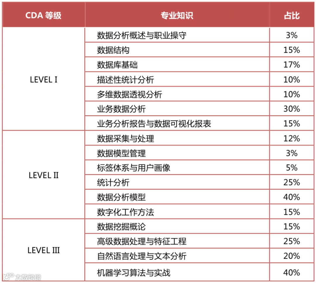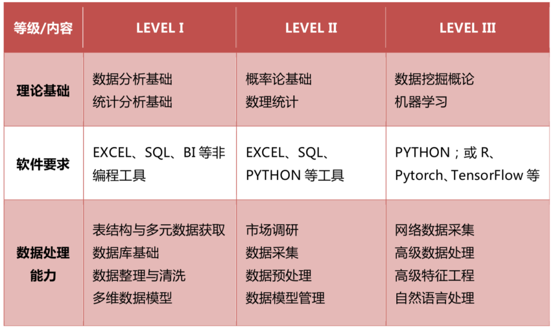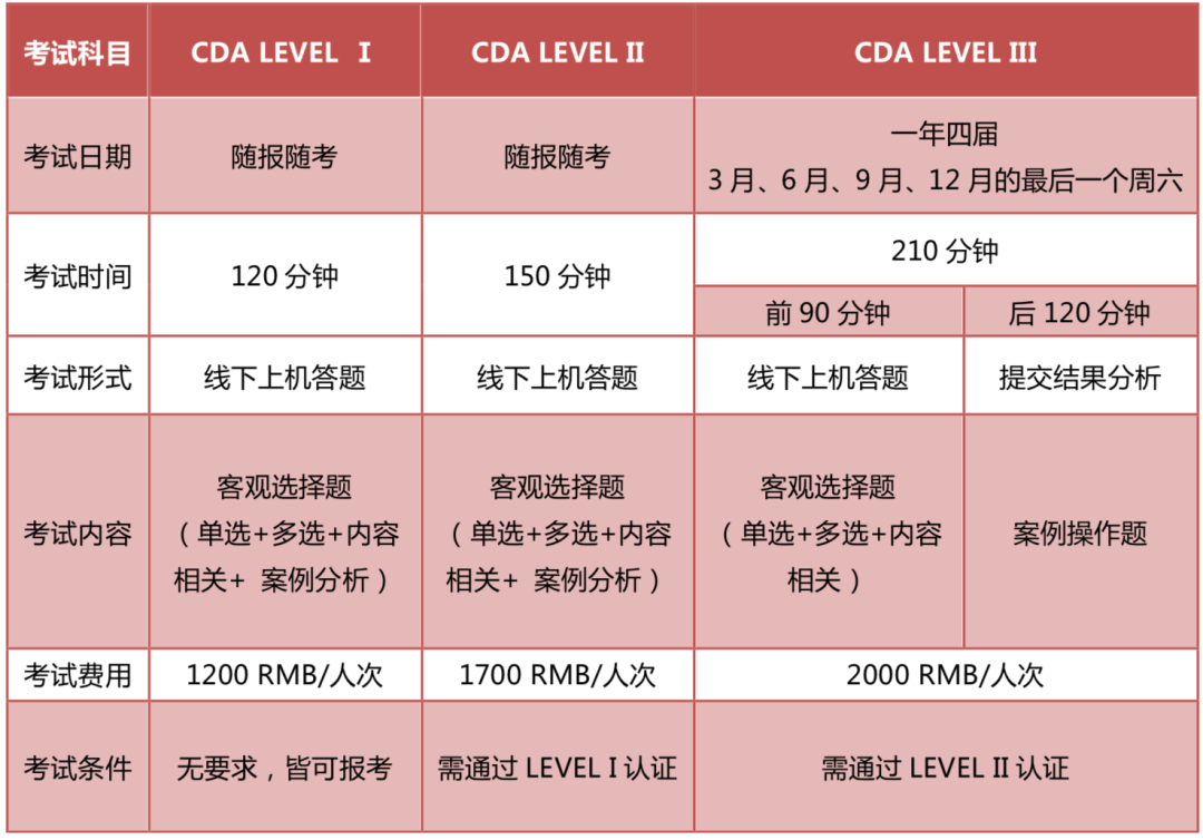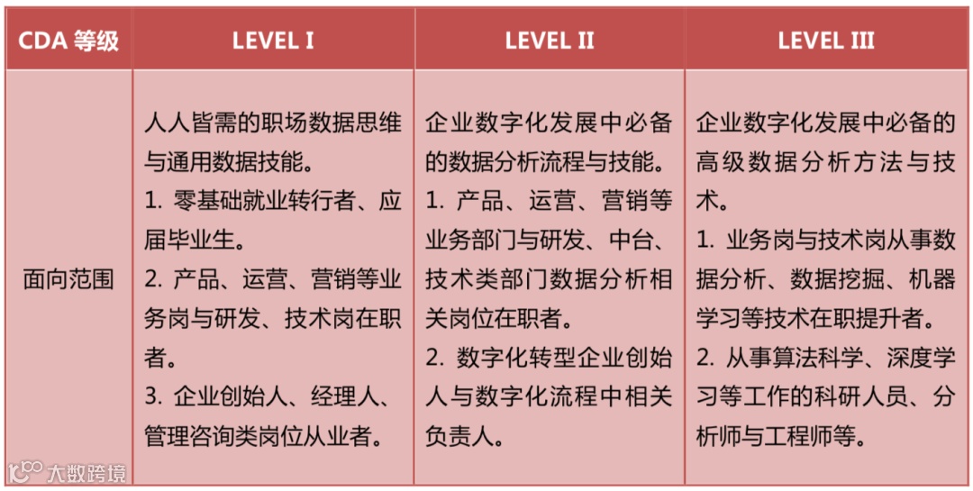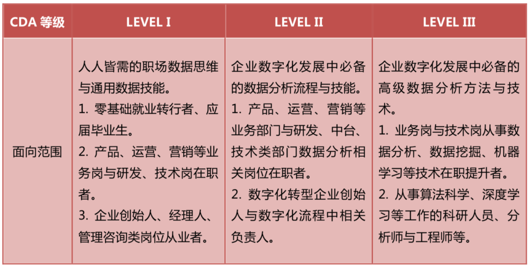 “CDA数据分析师认证”是一套科学化,专业化,国际化的人才考核标准,共分为CDA LEVELⅠ ,LEVEL Ⅱ,LEVEL Ⅲ三个等级。